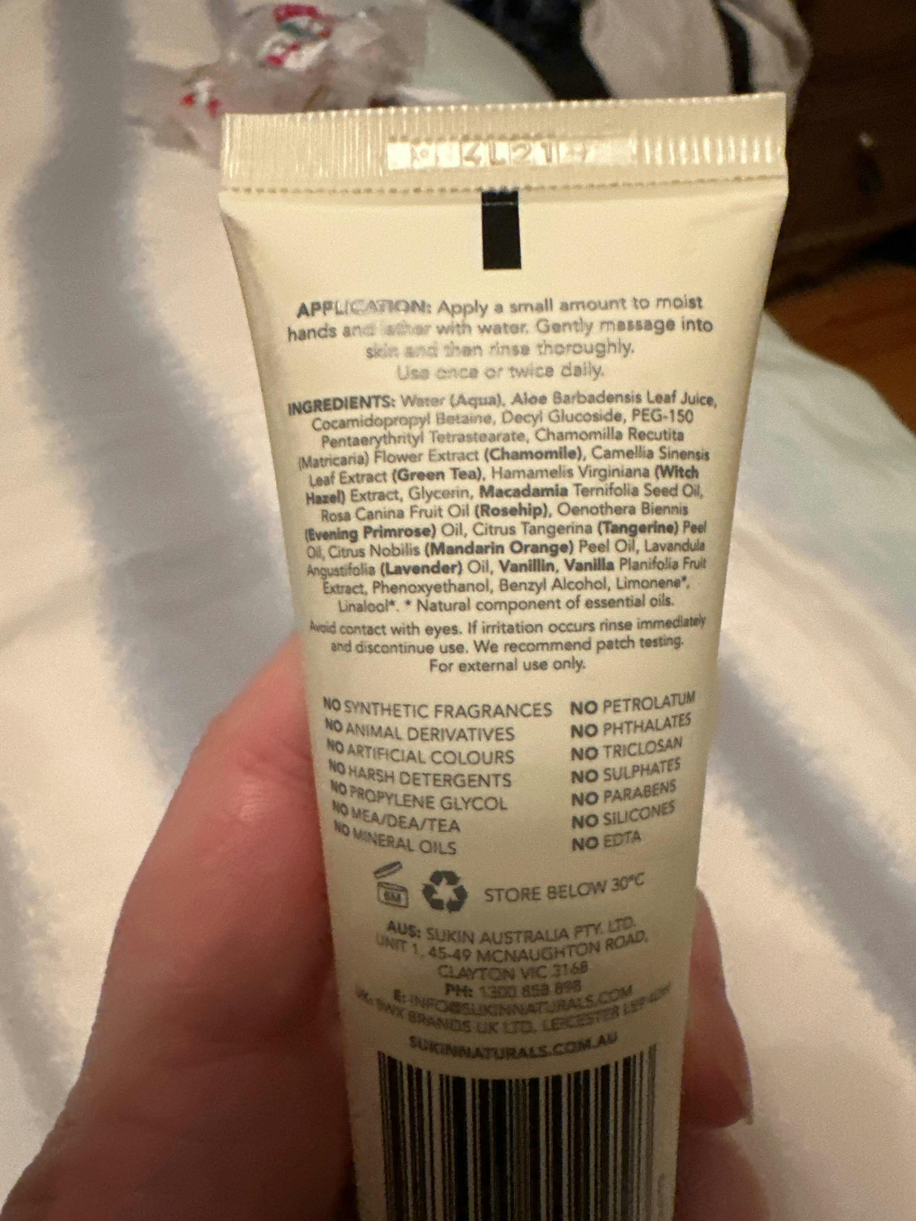 Water (Aqua), Aloe Barbadensis Leaf Juice, Cocamidopropyl Betaine, Decyl Glucoside, PEG-150 Pentaerythrityl Tetrastearate, Chamomilla Recutita (Matricaria) Flower Extract (Chamomile), Camellia Sinensis Leaf Extract (Green Tea), Hamamelis Virginiana (Witch Hazel) Extract, Glycerin, Macadamia Ternifolia Seed Oil, Rosa Canina Fruit Oil (Rosehip), Oenothera Biennis (Evening Primrose) Oil, Citrus Tangerina (Tangerine) Peel Oil, Citrus Nobilis (Mandarin Orange) Peel Oil, Lavandula Angustifolia (Lavender) Oil, Vanillin, Vanilla Planifolia Fruit Extract, Phenoxyethanol, Benzyl Alcohol, Limonene*, Linalool*. *Natural component of essential oils